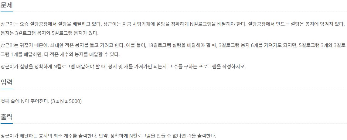 3키로 5키로 짜리 봉지로 적은 개수의 봉지를 배달할 수 있도록 하는 것인데, 뭐 이런 저런 방법으로 풀 수 있을 것 같다.